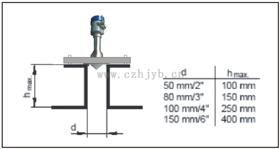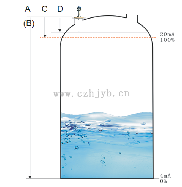 注:使用雷達物位計時,務必保證最高料位不能進入測量盲區(圖中D所示區域)。