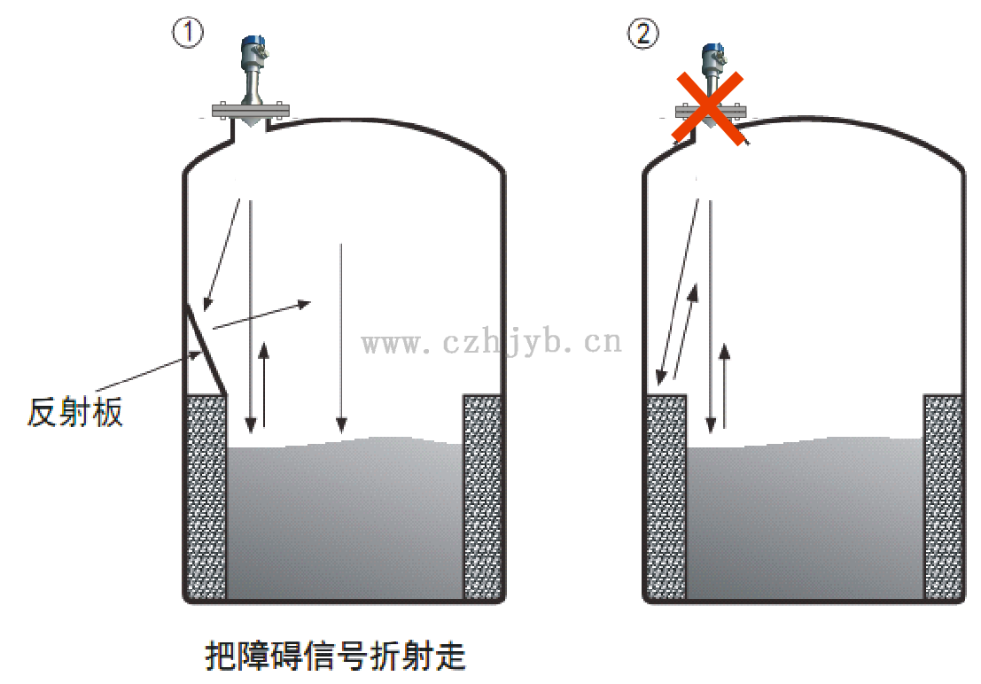 Ø 當罐中有障礙物影響測量時,要加裝反射板才能正常測量。