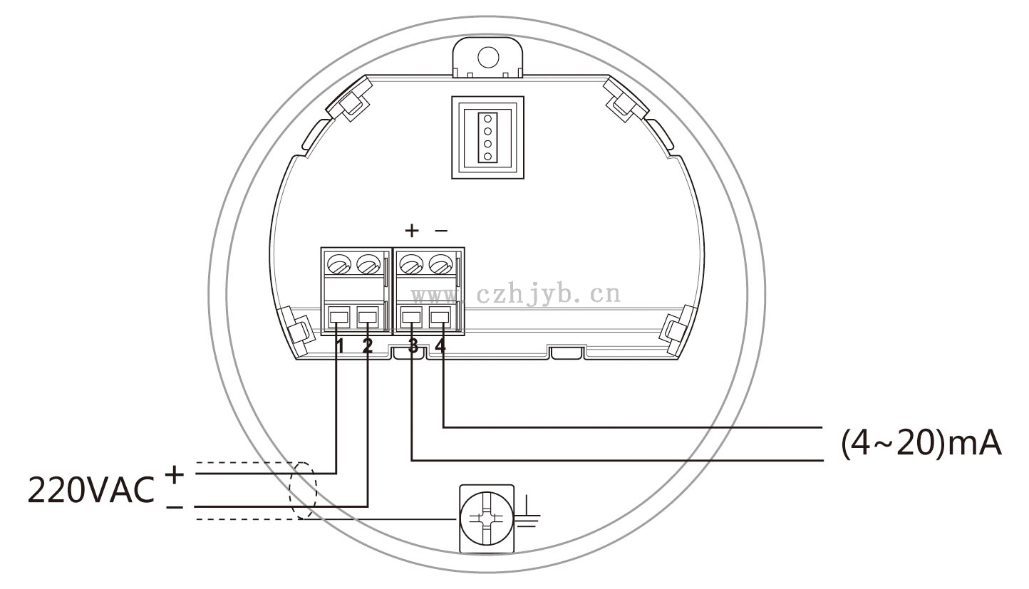 (4~20) mA/HART(兩線制)      供電電源和輸出電流信號共用一根兩芯屏蔽電纜線。具體供電電壓范圍參見技術數據。對于本安型須在供電電源與儀表之間加一個安全柵。